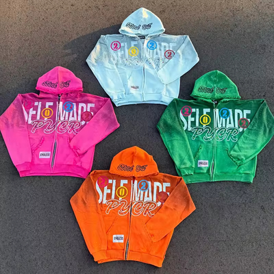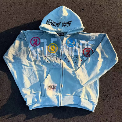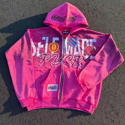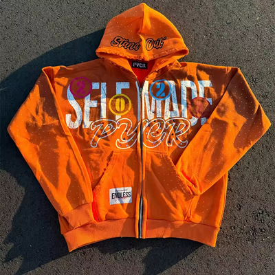 Custom Embroidery Ripped Screen Print Logo Zip-Up Hoodies|Unisex Rhinestone Heavyweight Hoodies|Organic Cotton Boxy Fit Hoodies